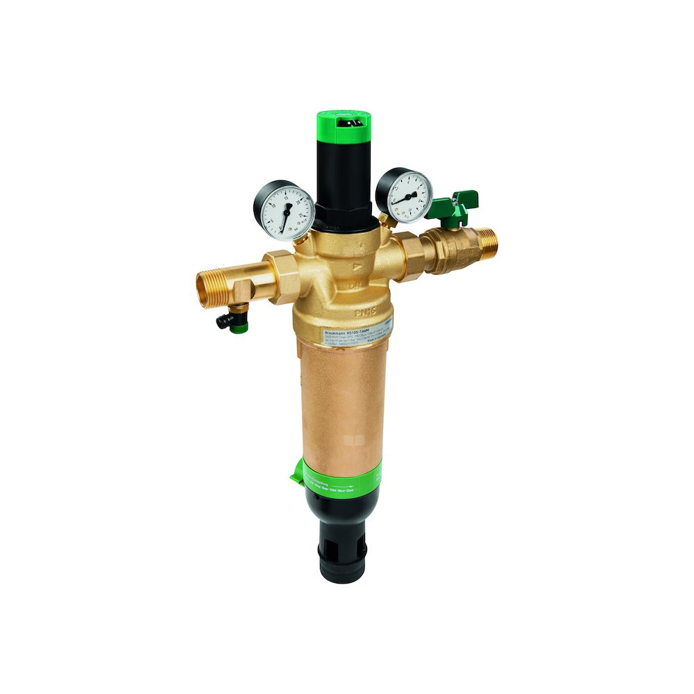 Stacja HS10S składa się z wbudowanych elementów tj.: zawór zwrotny z króćcem testowym, filtra z płukaniem wstecznym, zaworu redukcyjnego oraz odcinającego. Woda przepływa najpierw przez zawór zwrotny. Powoduje to naciskanie sworznia zaworu przeciwnie do działania sprężyny i otwieranie zaworu. Podczas płukania wstecznego zanieczyszczenia są usuwane ze zrzutem wody przez zawór kulowy. Filtry z technologią podwójnej spirali wyposażone są w łopatki turbiny, które cyrkulują wodę i tym samym wprawiają turbinkę górnej części wkładu filtra w ruch obrotowy. Jednocześnie wewnętrzny wirnik spłukuje cząstki przylegające do górnej części filtra. Regulator ciśnienia działa na zasadzie równowagi sił. Siła działająca na membranę jest przeciwstawna do siły nacisku sprężyny regulacyjnej. Ciśnienie wlotowe nie ma wpływu, ani na otwieranie, ani na zamykanie zaworu. Z tego też powodu wahania ciśnienia wejściowego nie mają wpływu na ciśnienie wyjściowe