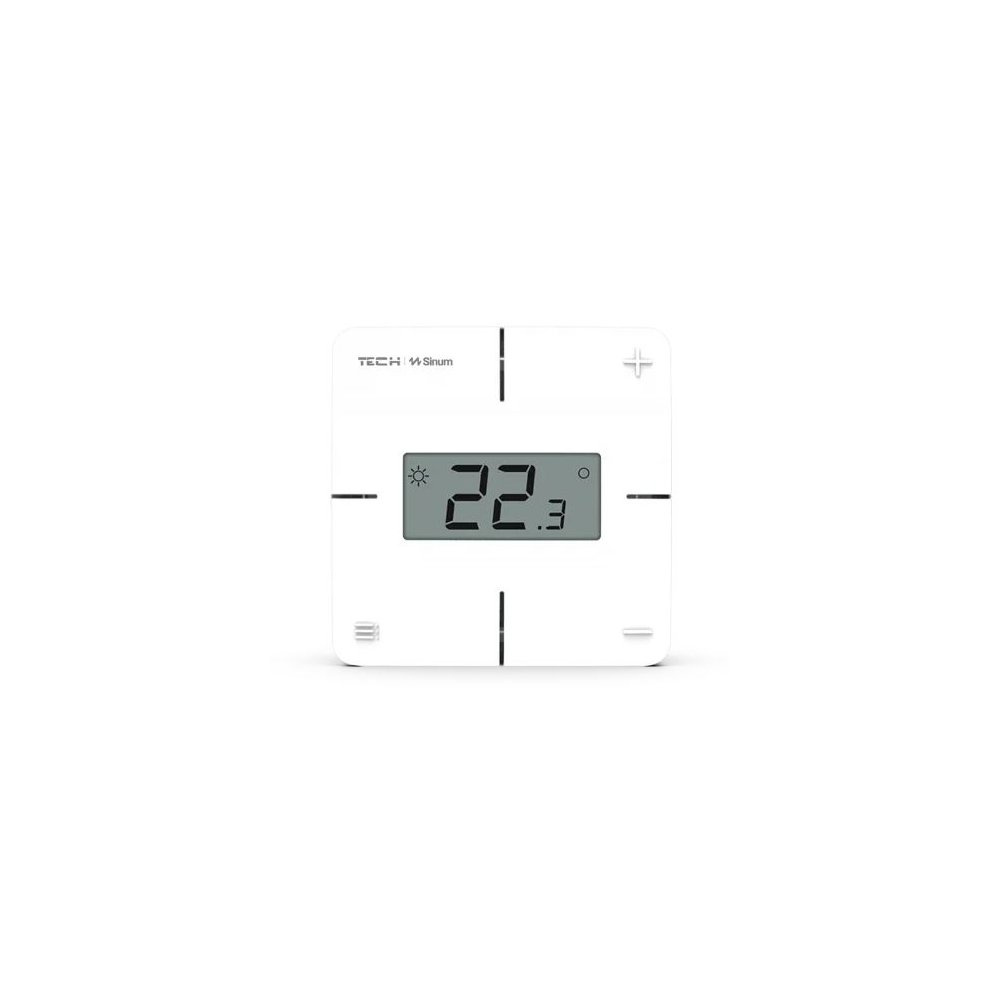 Przewodowy regulator R-S1 wyposażony jest w czytelny wyświetlacz z mechanicznymi przyciskami. Dodatkowo posiada czujnik wilgotności powietrza.