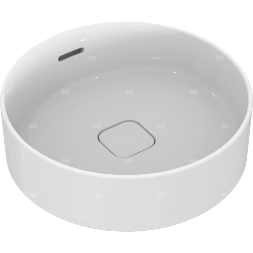 Umywalka Strada II bez otworu na baterię, ze szczelinowym przelewem i korkiem o białej pokrywie. W komplecie zestaw montażowy i szablon do wycinania. Opcjonalny montaż z korkiem typu Click-clack z metalową pokrywą T3629AA. W przypadku montażu z baterią z korkiem automatycznym zalecane jest zamówienie przedłużonego cięgna korka A960200AA.