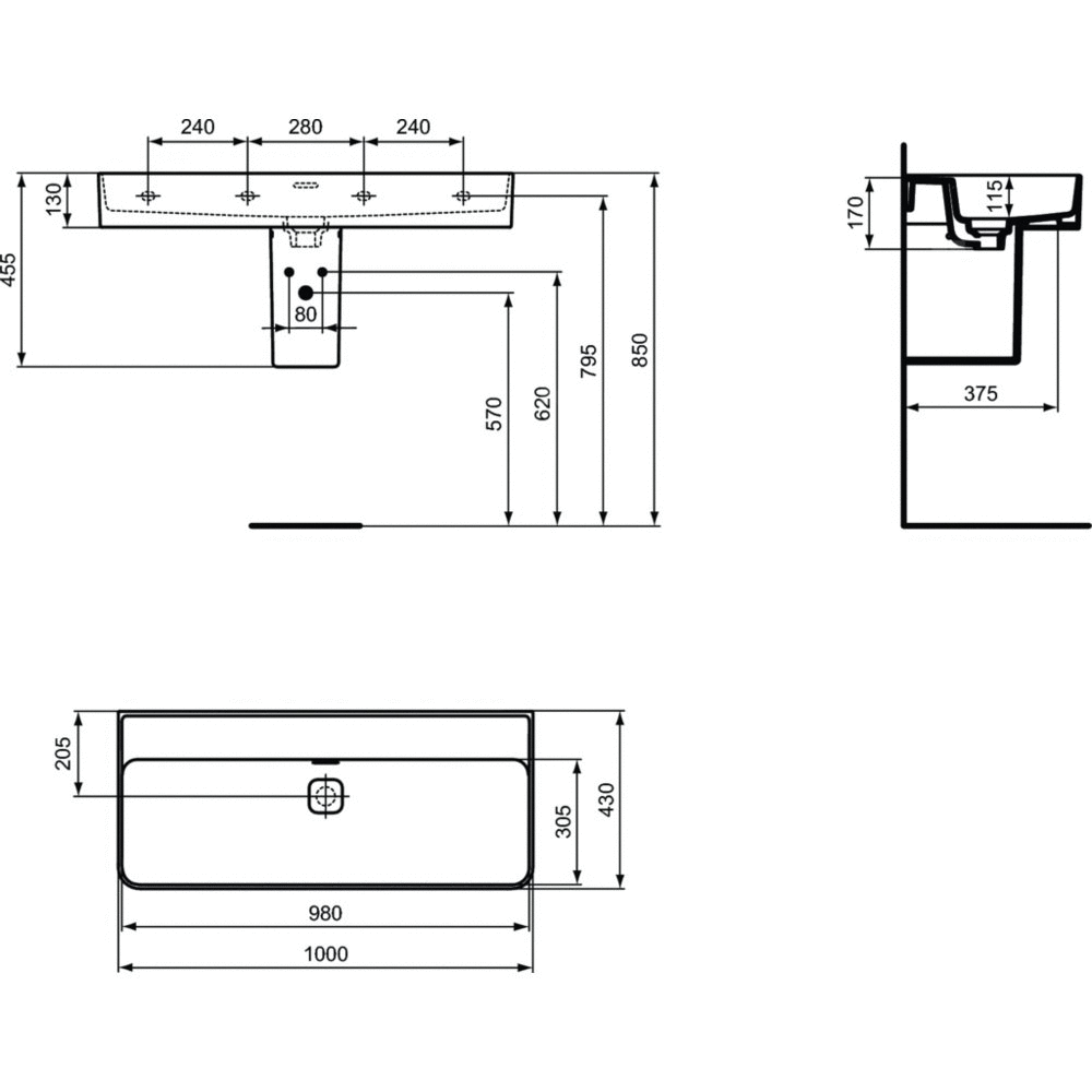 Umywalka Strada II bez otworu na baterię, z przelewem o szczelinowym kształcie oraz korkiem o białej pokrywie. Do montażu z meblami, półpostumentem T299601 lub samodzielnie z syfonem. Opcjonalny montaż z korkiem typu Click-clack z metalową pokrywą T3629AA. Zalecane wyposażenie: zestaw montażowy M10 x 140 mm.