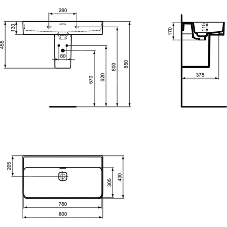 Umywalka IDEAL STANDARD STRADA II prostokątna (zaokrąglone krawędzie), biała, 800mm, bez otworu na baterię, nakładany od góry, bez odpływu przelewowego