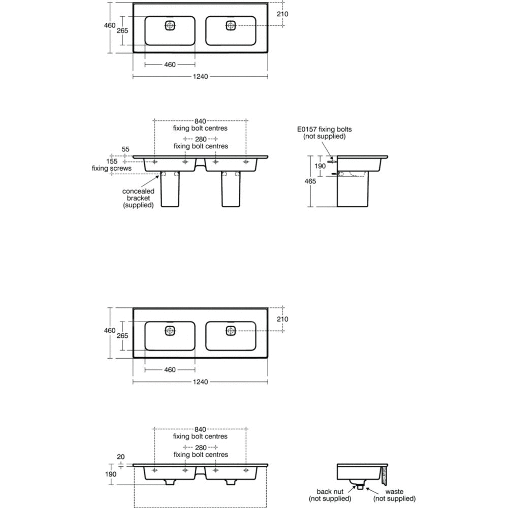 Umywalka podwójna Strada II bez otworów na baterie, z przelewami o szczelinowym kształcie. Komlet zawiera 2 korki o białych pokrywach T854601. Do montażu z meblami, półpostumentem T299601 lub samodzielnie z syfonem. Opcjonalny montaż z korkiem typu Click-clack z metalową pokrywą (T3629AA). Zalecane wyposażenie: zestaw montażowy M10 x 140 mm - do zamówienia 2 zestawy (mocowanie 4-punktowe).