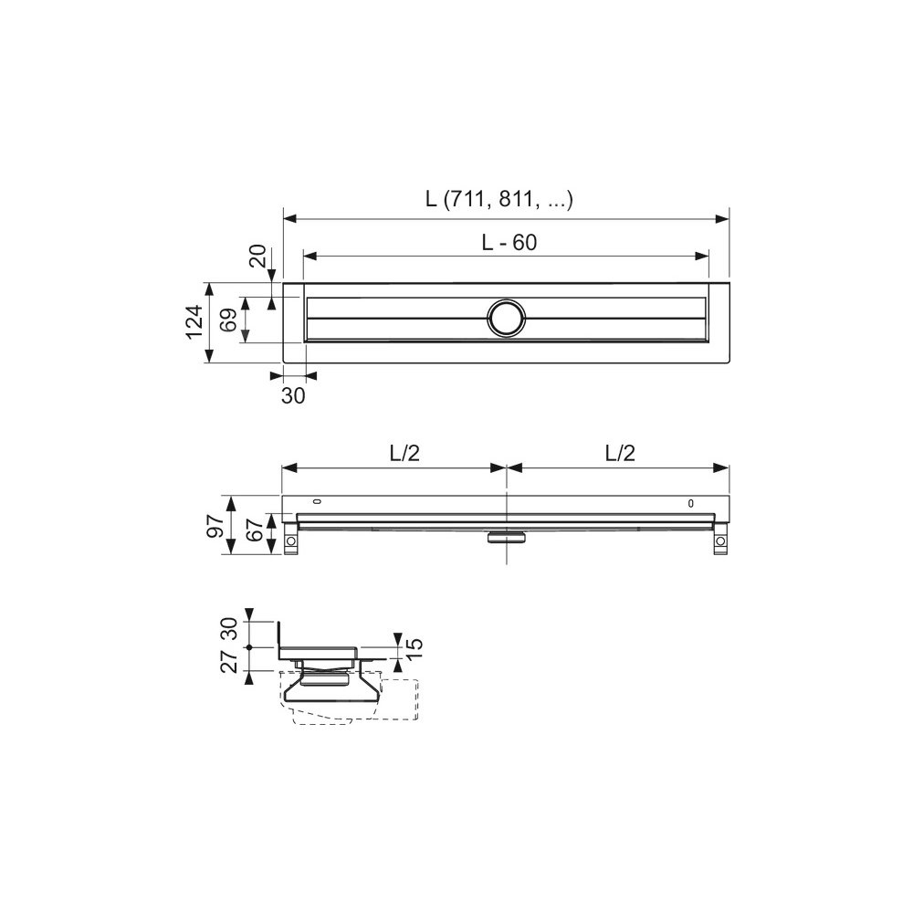 Korpus rynny prostej z profilem przyściennym do montażu w jastrychu przy ścianie, z kołnierzem i taśmą uszczelniającą Seal System, co umożliwia wykonanie trwałego i bezpiecznego uszczelnienia przeciwwilgociowego w połączeniu z izolacją posadzki i ściany.