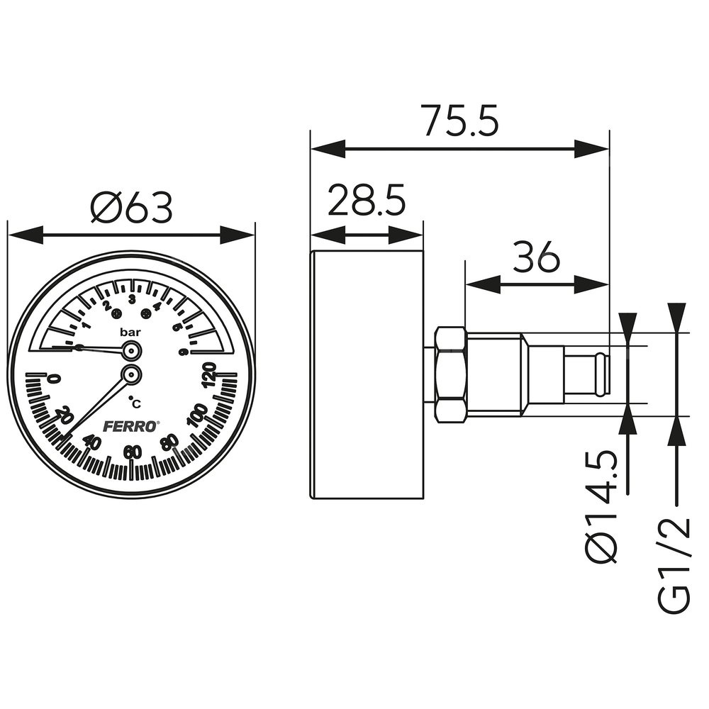 Termometr bimetaliczny FERRO fi 63 mm 120'C 6 bar połączenie aksjalny