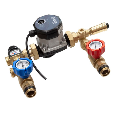 Grupa pompowo-mieszająca do regulacji temperatury ogrzewania podłogowego w zakresie 20-43°C z pompą QIK Kv 1,6. Wyposażenie: • pompa elektroniczna QIK 25-8/130 • termostatyczny zawór 3-drogowy ESBE • odpowietrznik automatyczny Flamco • zawór kulowy z termometrem – 2 szt. • system łączników i nypli mosiężnych do szybkiego montażu do rozdzielaczy i zasilania / powrotu