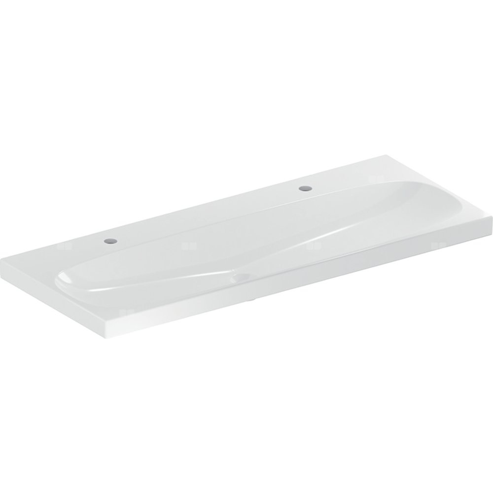Umywalka GEBERIT Acanto 2-stanowiskowa prostokątna, biała / KeraTect, 1200mm, otwór na baterię na środku, bez odpływu przelewowego, półka od ściany