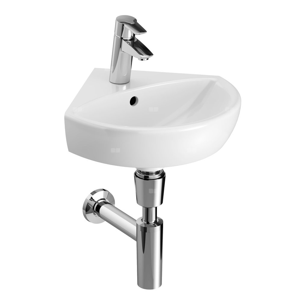 Umywalka GEBERIT Selnova narożna okrągła, biała, 410mm, otwór na baterię na środku, montaż na ścianie, z odpływem przelewowym, półka od ściany