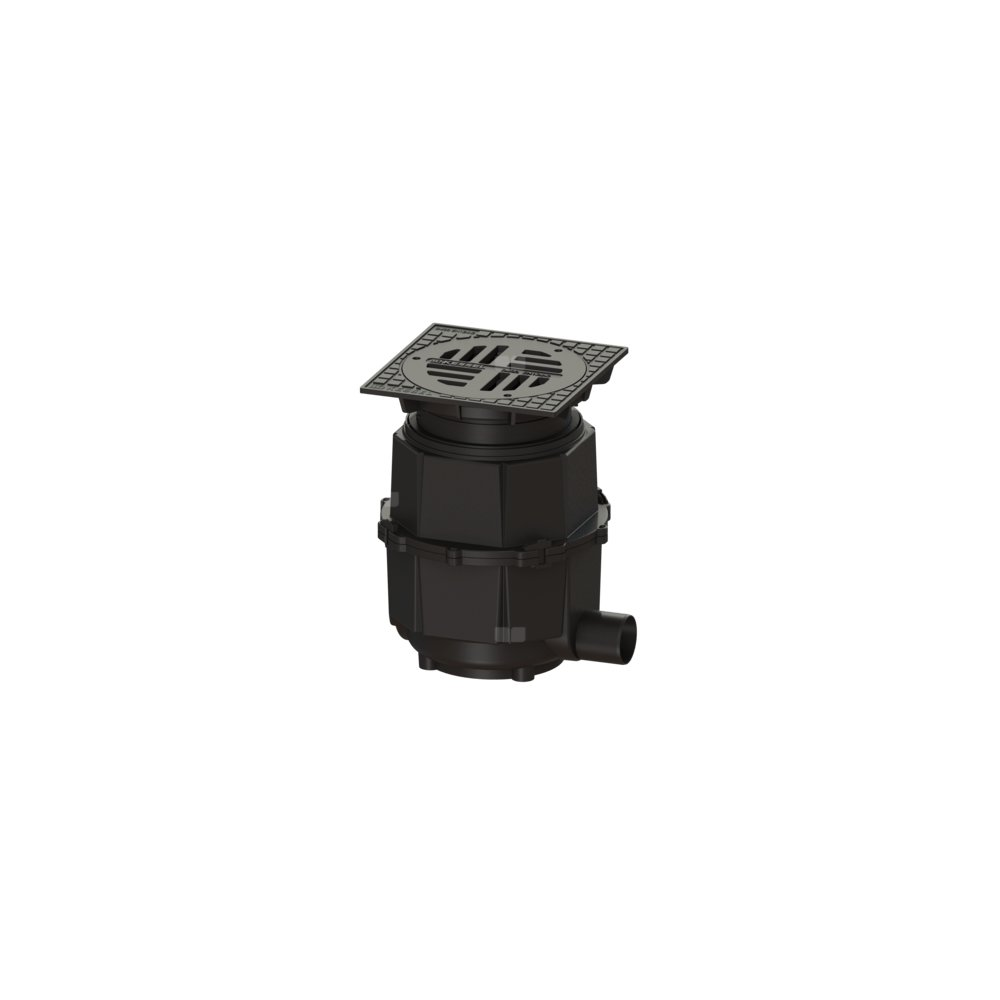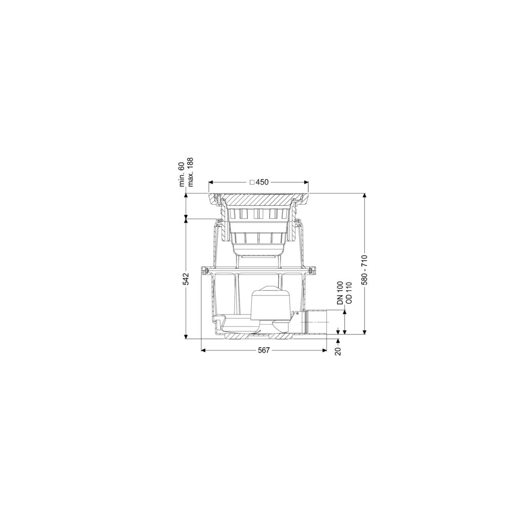 KESSEL Wpust podwórzowy, wielkość nominalna (DN) 100, głębokość zabudowy 580 - 710 mm, klasa obciążenia D 400, syfonem w zestawie, pokrywa Żeliwo szare, szer. pokrywy 450 mm, dł. pokrywy 450 mm, odwodnienie przez odpływ punktowy, króciec boczny, korpus Tworzywo sztuczne