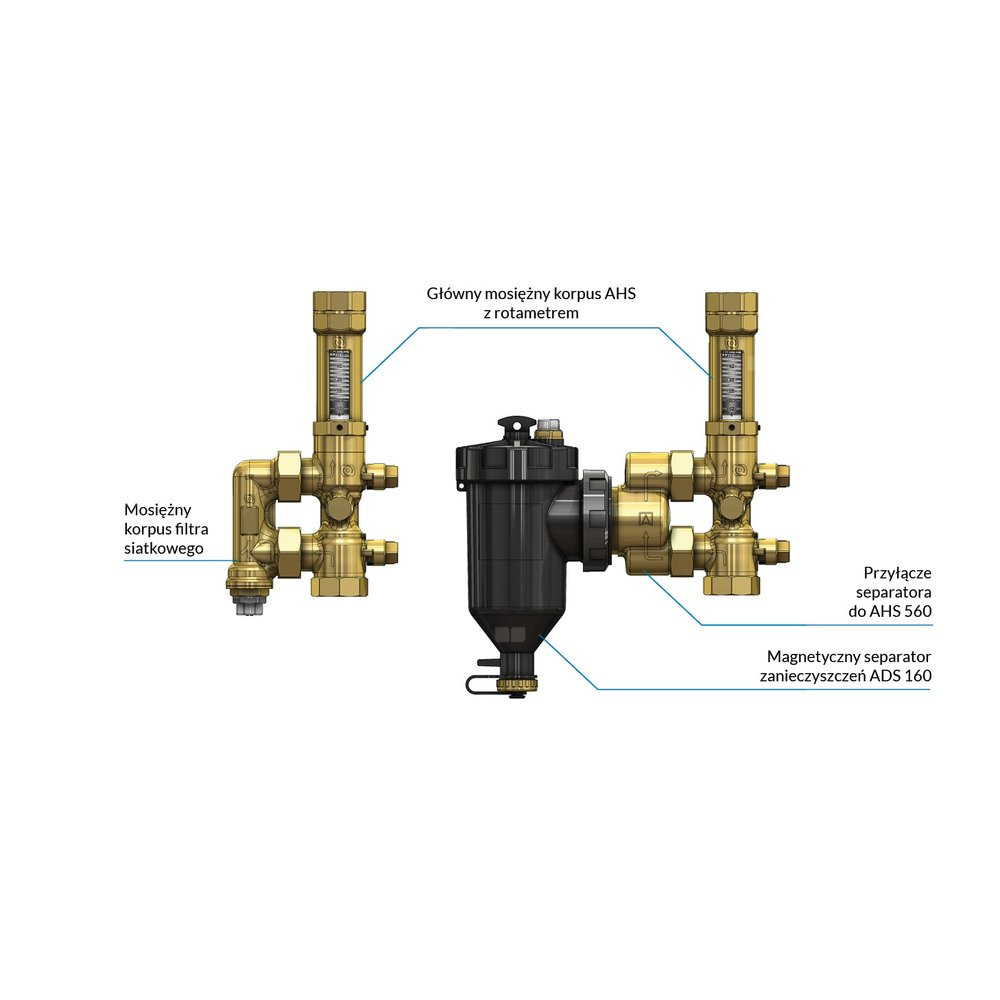 Zespół armatury serwisowej AHS 560 do pomp ciepła, z separatorem zanieczyszczeń ADS 160, z przepływomierzem 5 - 42 l/min, przyłącza GW G1''