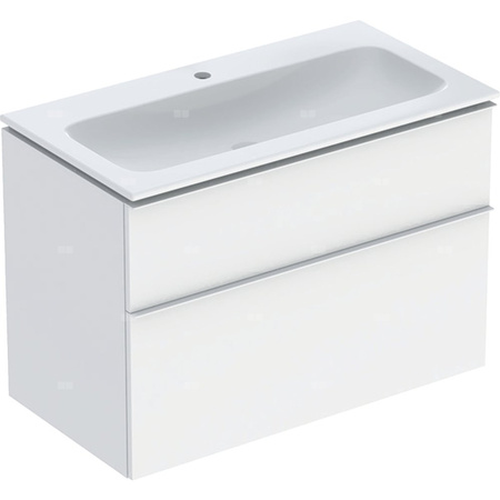 Zestaw umywalki meblowej Geberit iCon slim rim, z szafką pod umywalkę, z dwoma szufladami i zestawem odpływowo-przelewowym do umywalki: B=90cm, Umywalka: biały /KeraTect, Korpus i front: biały / lakierowany matowy, Uchwyt: biały / powlekany proszkowo, mat