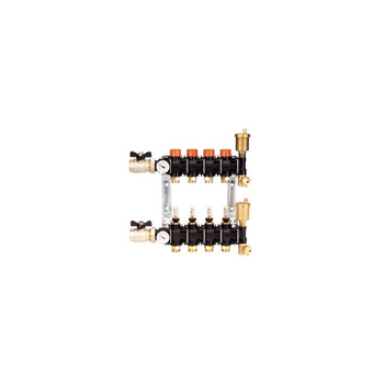 Modułowy rozdzielacz poliamidowy z przepływomierzem i wkładką zaworową (spust, napełnienie, regulacja, termometr, odpowietrzenie, zawory kulowe) 6 sekcji